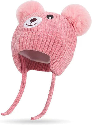 Caciula Tricotata pentru Copii, Clape pentru Urechi si Snururi, Calduroasa, Model Ursulet Roz