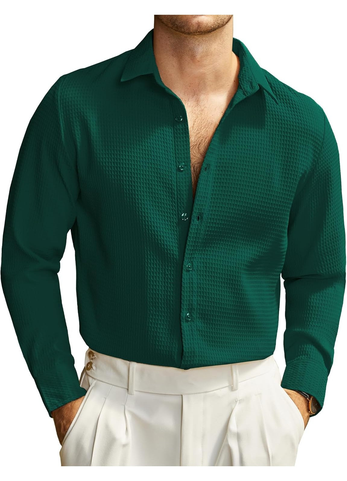 Camasa eleganta barbati JOGAL, poliester, marimea XXL, slim fit, maneca lunga, model texturat, inchidere cu nasturi, culoare verde inchis