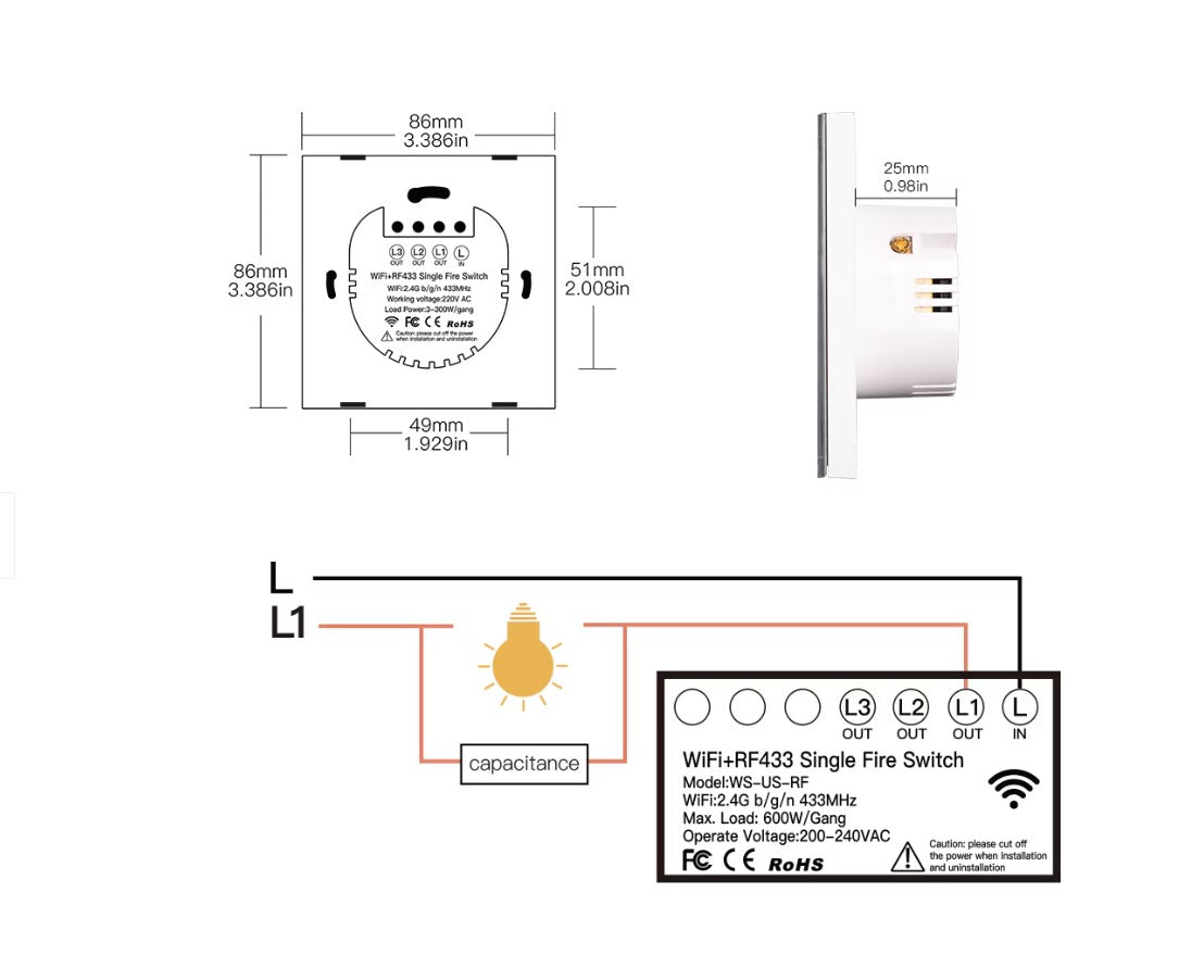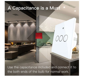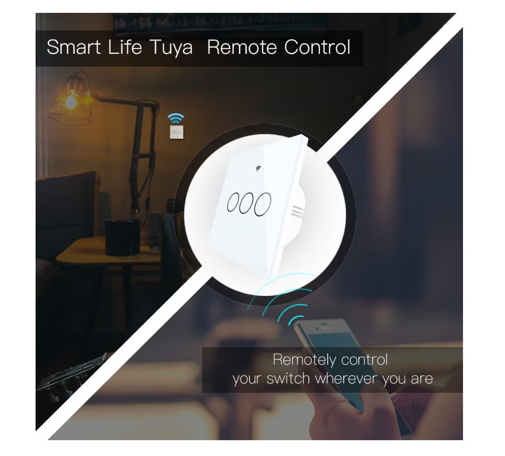 Nu necesita conductor neutru. Dispune de conectivitate Wi-Fi si RF si poate fi conectat la alte intrerupatoare inteligente prin aplicatia Smart Life / Tuya (Multi-Control), avand functii pentru activarea/dezactivarea iluminarii. De asemenea, are un panou din sticla rezistenta la zgarieturi