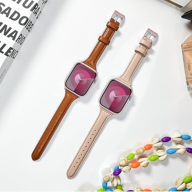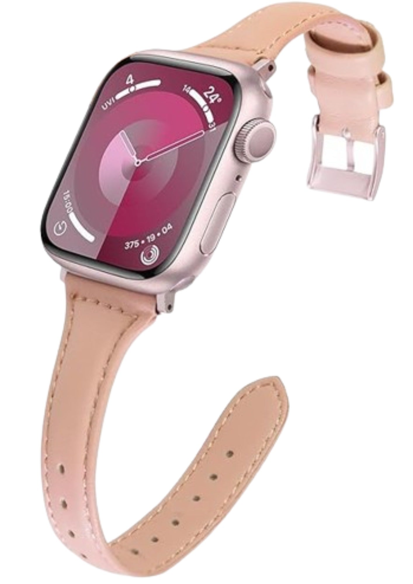 Curea de Smartwatch Lovmunia, Subtire, Piele, compatibila cu Apple Watch Ultra/SE/9/8/7/6/5/4/3/2/1 - 38/40/41/42/44/45/49MM, culoare Roz cu Auriu