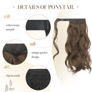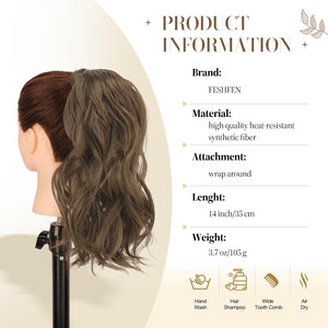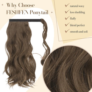 Extensie coada FESHFEN, par sintetic ondulat, 35 cm, rezistent la caldura, prindere wrap around cu pieptene, castaniu