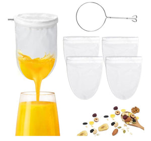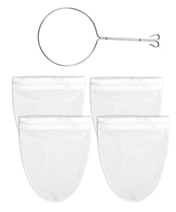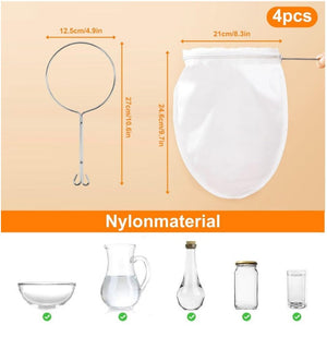 Filtre reutilizabile, Set 1 suport, 4 saci de bumbac de mare densitate, tifon pentru filtrarea laptelui de nuci vegan, sucuri de legume si alte lichide