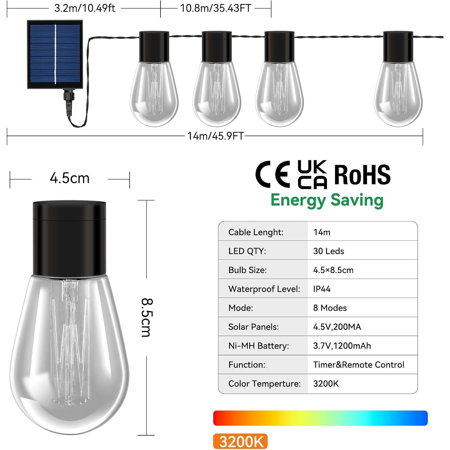 Ghirlanda Solara ZEWETO, 30 LED, 14m, 8 Moduri, Telecomanda, IP44, Lumina Alb Cald, Exterior si Interior