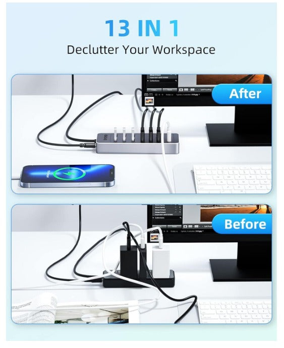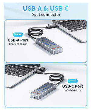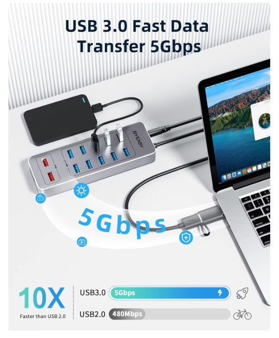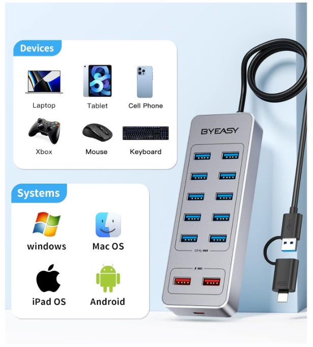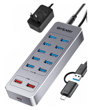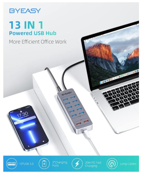 Hub USB C BYEASY, Activ 3.0, 13 in 1 cu 10 Porturi USB 3.0, 2 Porturi de Incarcare USB A si 1 Port de Incarcare USB C, 12V, 3A