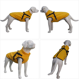 Jacheta impermeabila pentru caini Lovelonglong, interior din fleece, marime 2XL, moale, cu ham integrat, reflectorizant, culoare galben