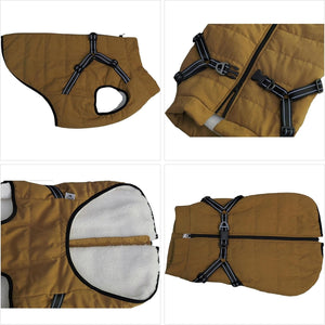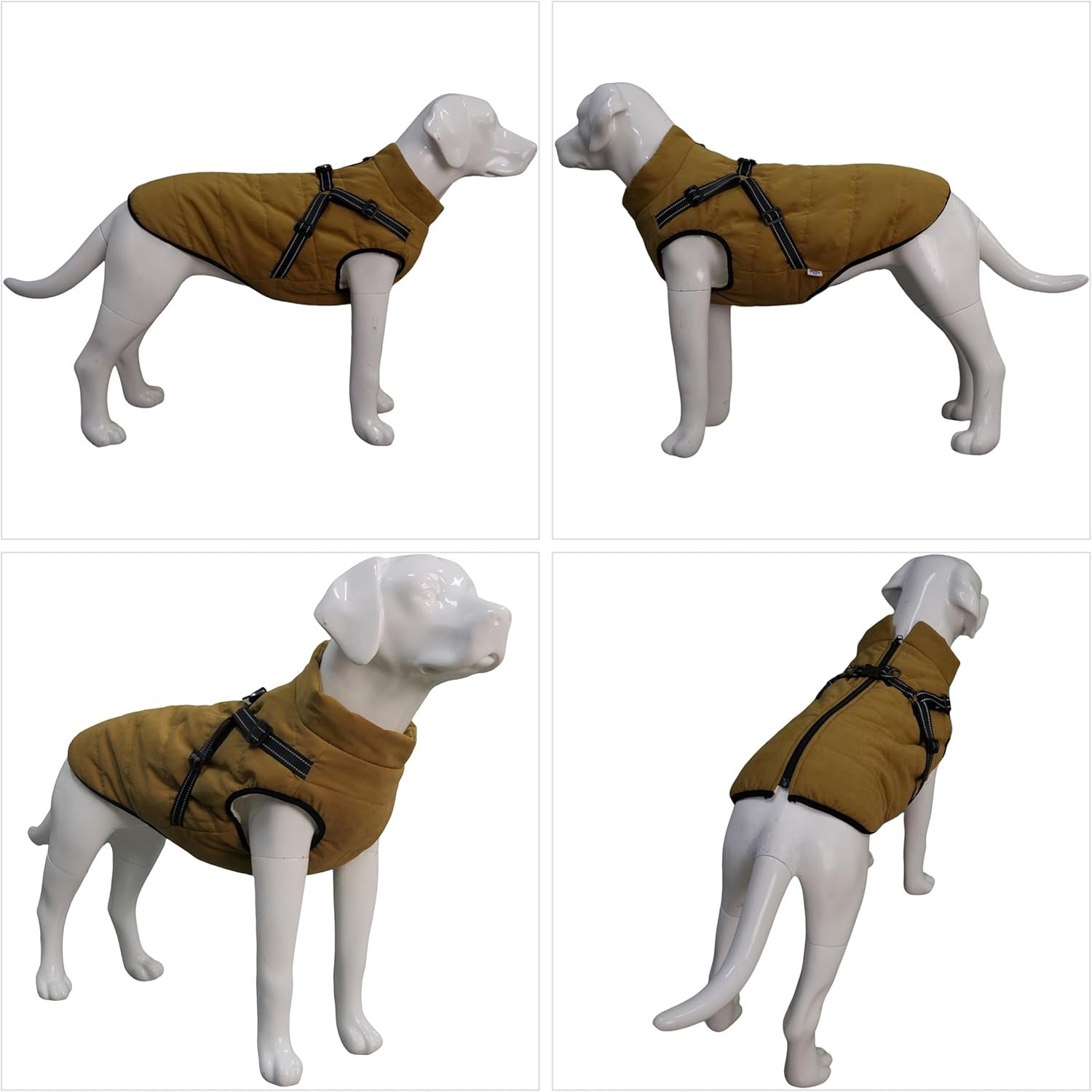 Jacheta impermeabila pentru caini Lovelonglong, interior din fleece, marime L, moale, cu ham integrat, reflectorizant, culoare kaki