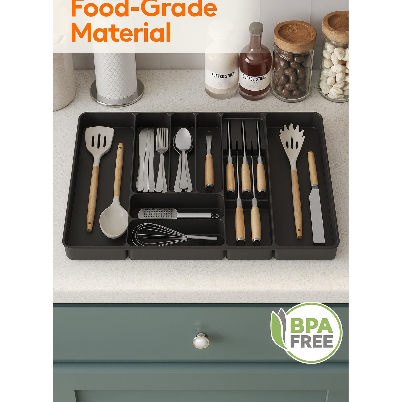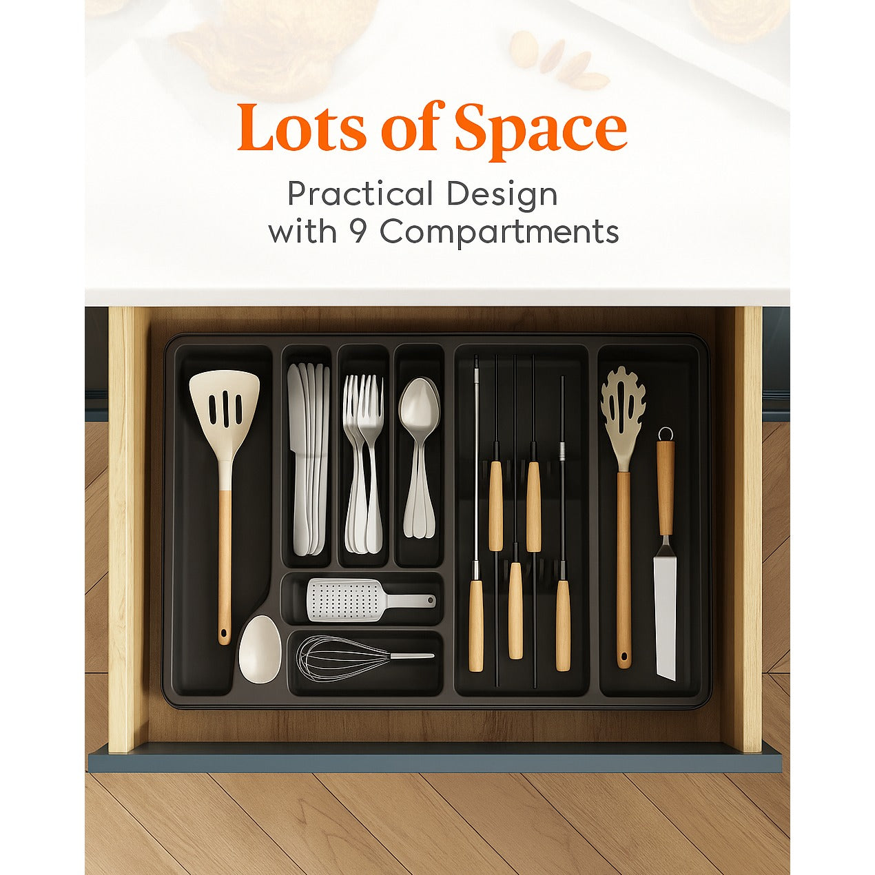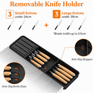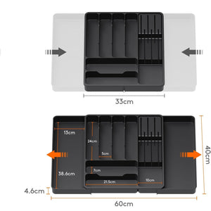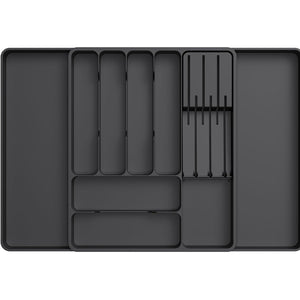 Organizator Tacamuri Lifewit, 33-60x40x4.6 cm, Extensibila, Suport Detasabil pentru Cutite, 9 Compartimente, Plastic Rezistent, Negru