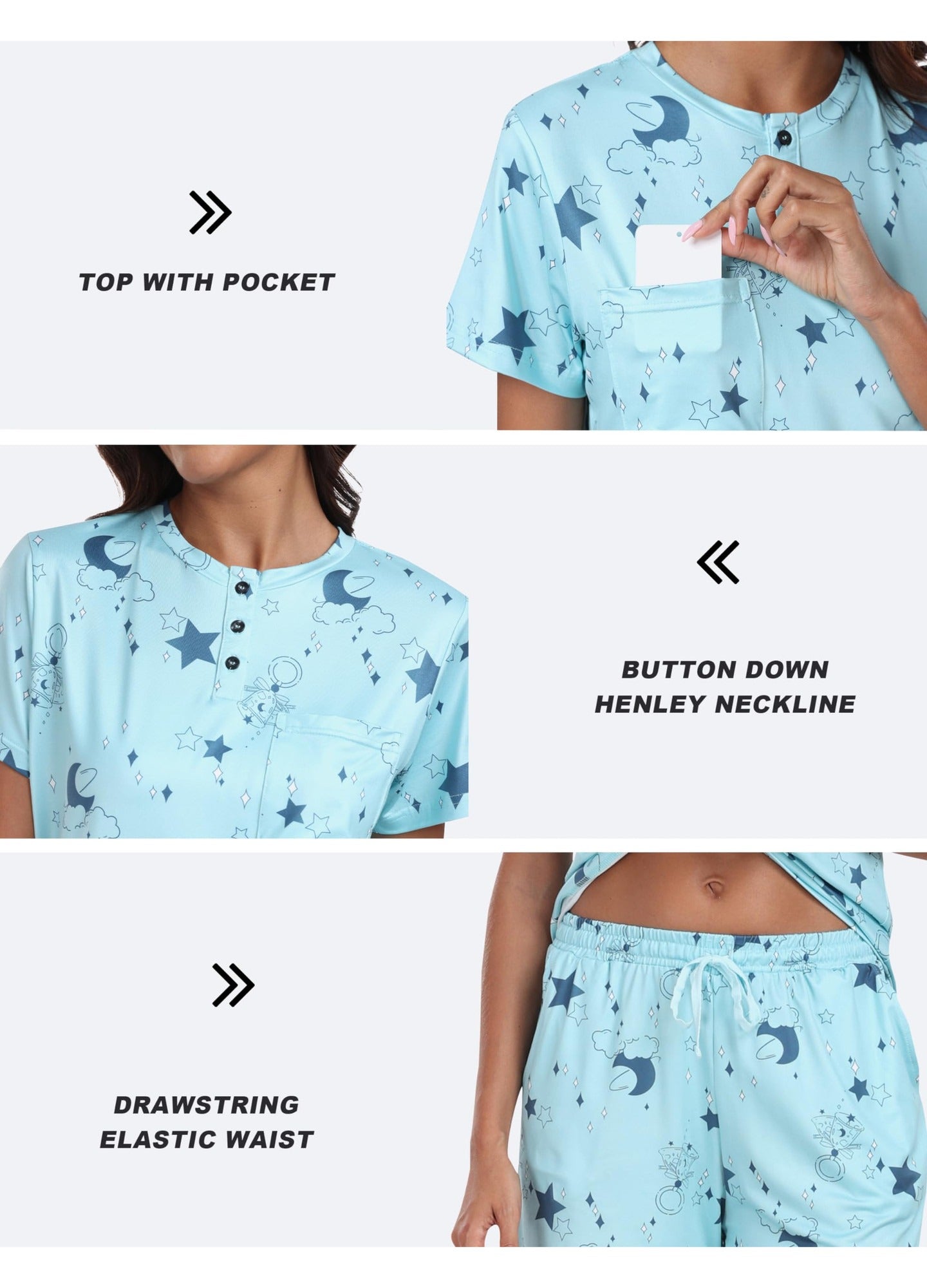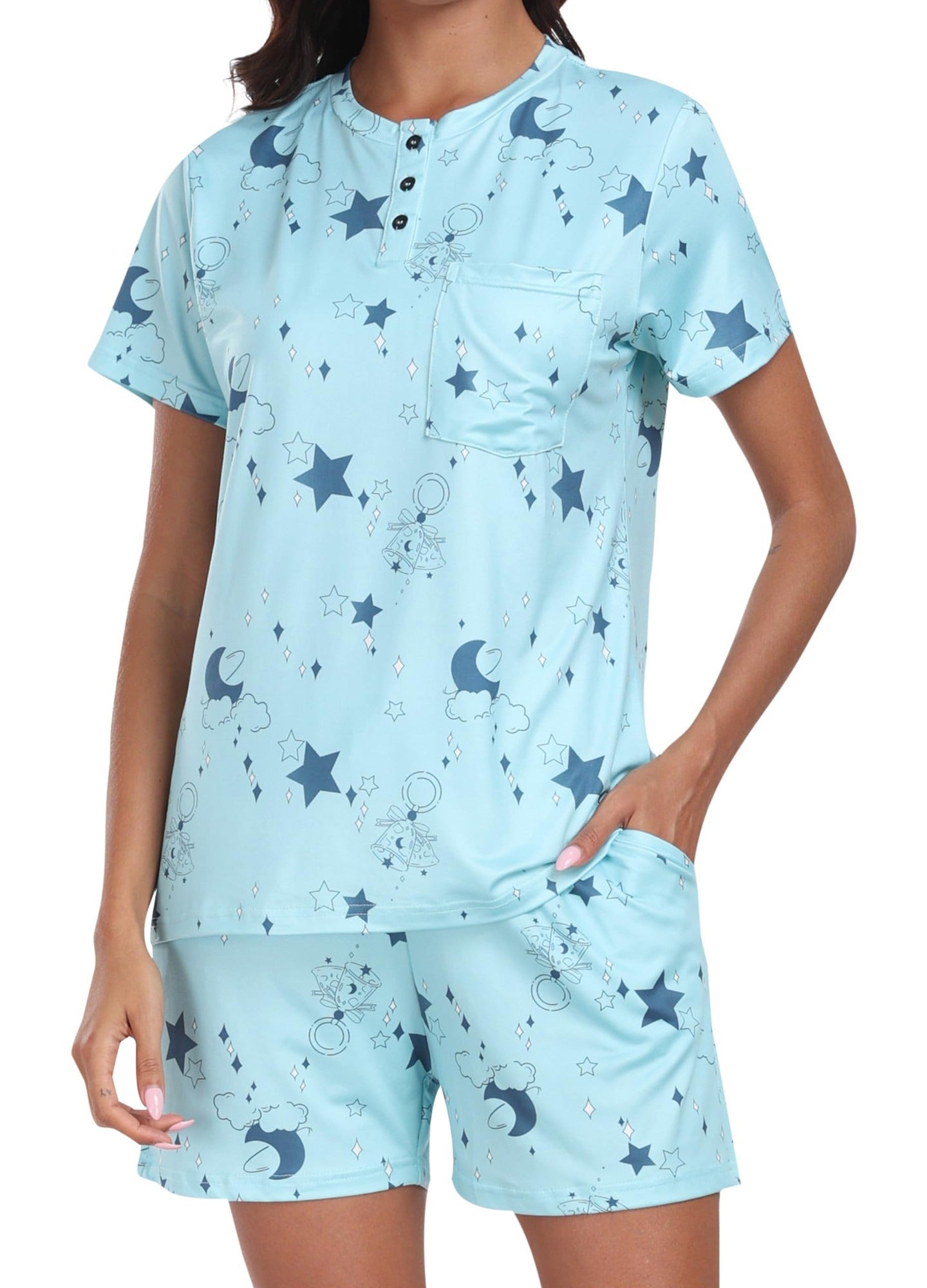 Pijama de dama MoFiz, 2 piese, poliester si elastan, marimea L, pantaloni scurti si tricou, culoare albastru