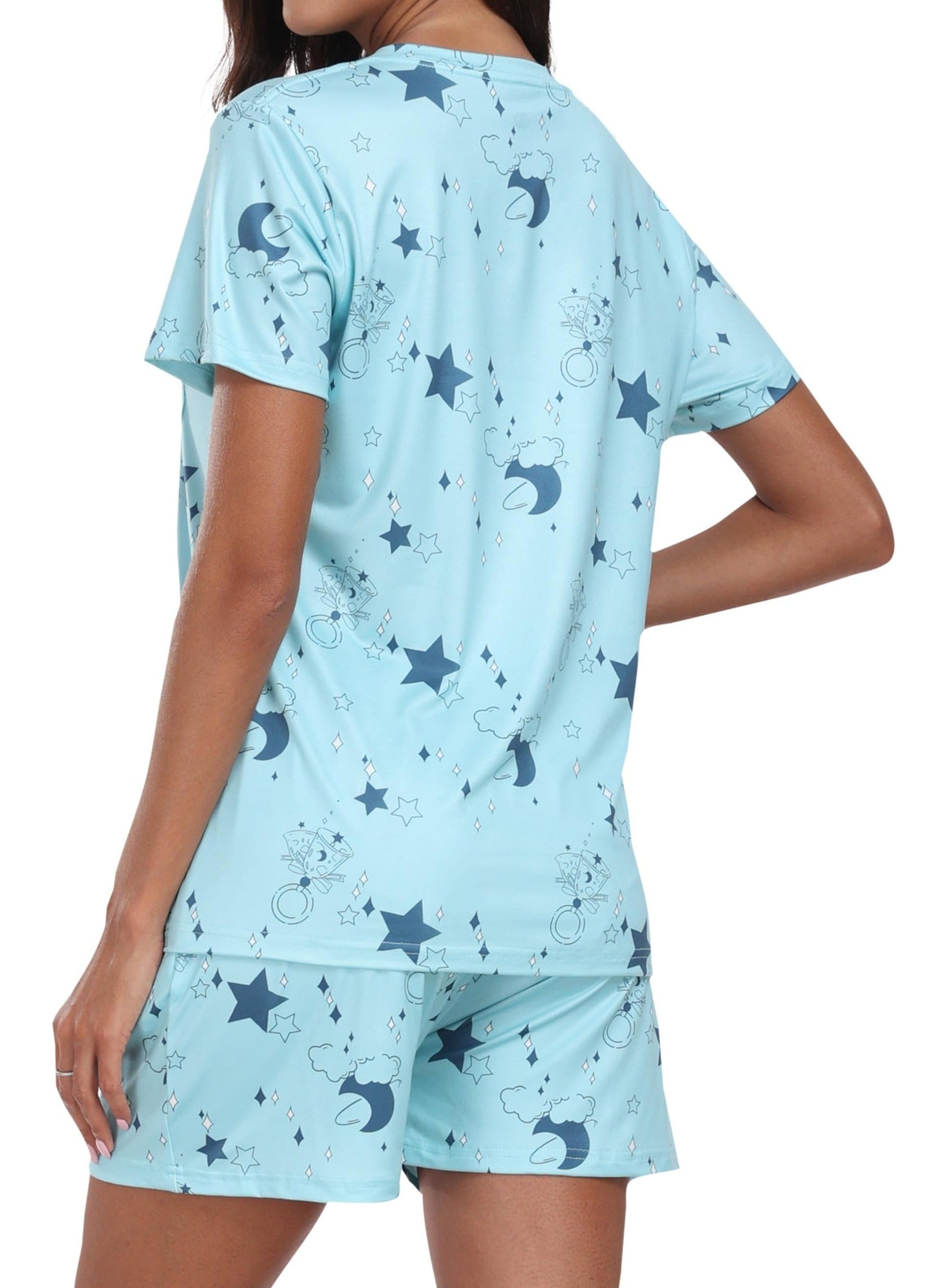 Pijama de dama MoFiz, 2 piese, poliester si elastan, marimea S, pantaloni scurti si tricou, culoare albastru