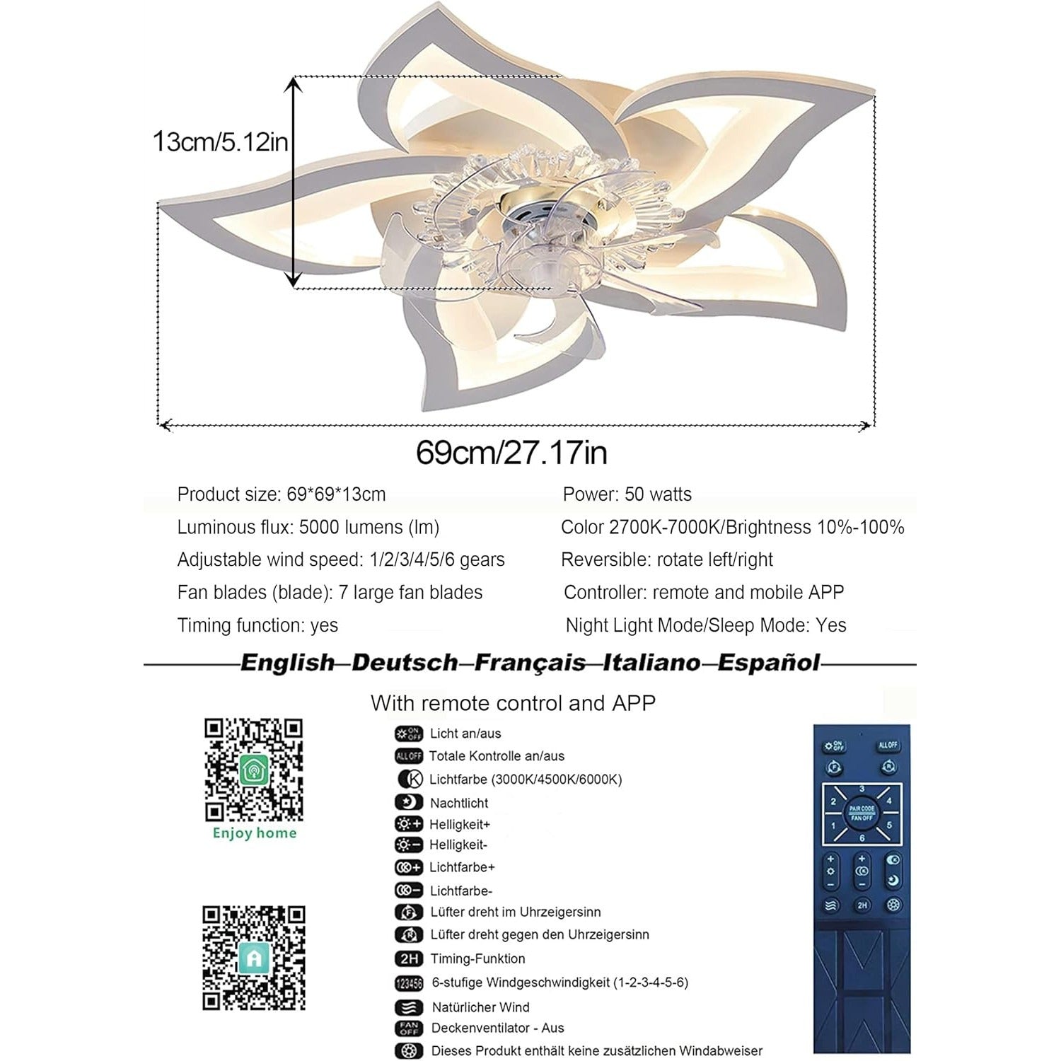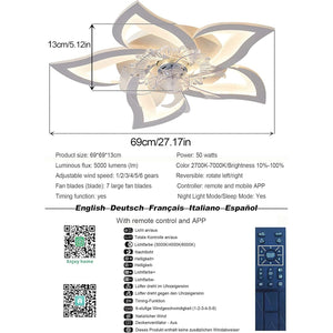 Plafoniera LED cu ventilator AiPaiTe, 69 cm, 50W, 5000 lm, 6 viteze, dimabil 2800-7000K, control prin telecomanda si aplicatie, functie timer, design modern, culoare alb