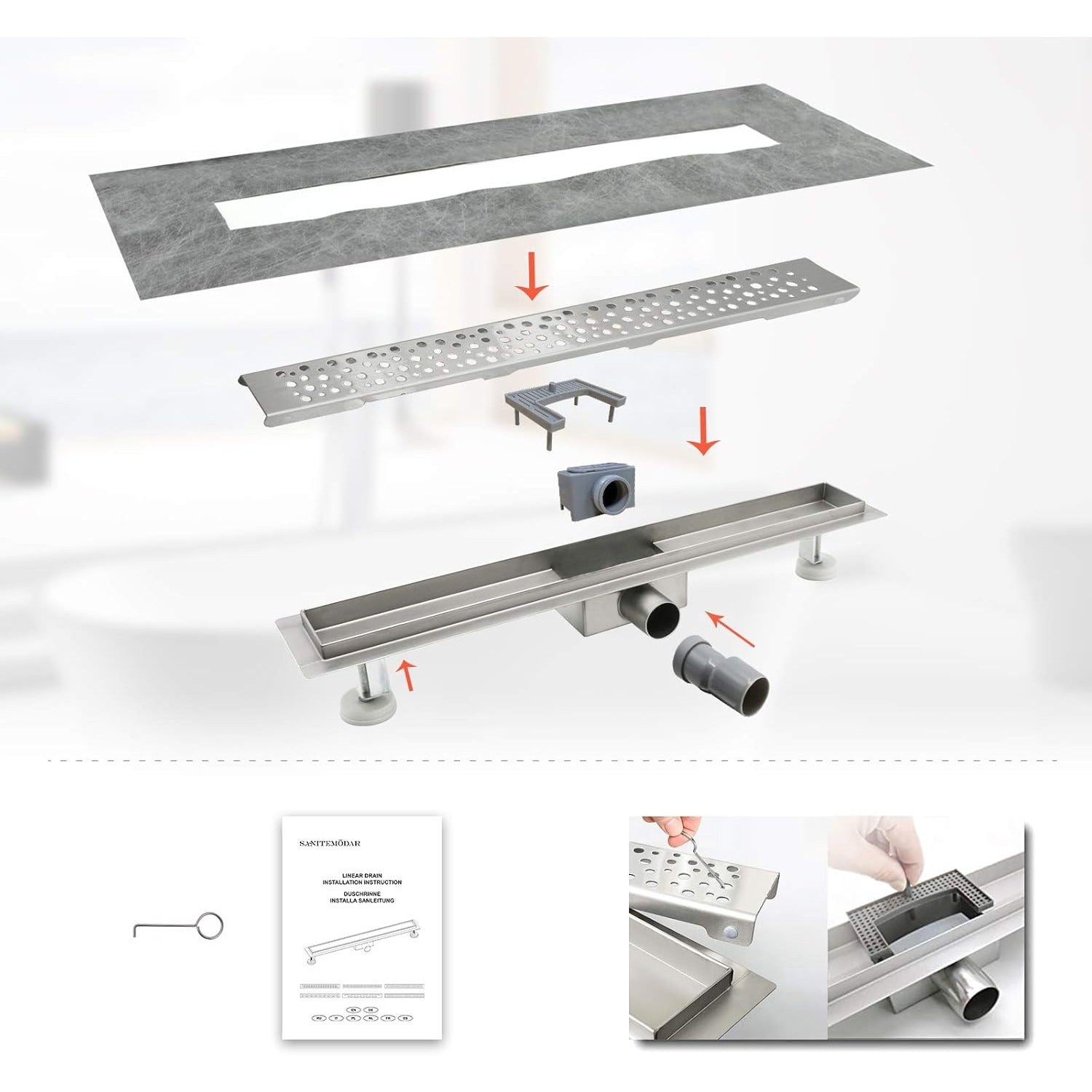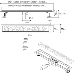 Rigola Dus SaniteModar, 90 cm, Otel Inoxidabil 304, Debit 30 L/min, Sifon antimiros si filtru par, Capac detasabil, Picioare reglabile, Argintiu