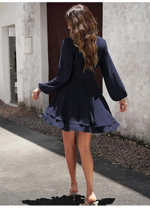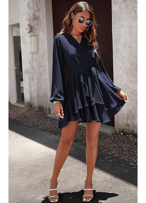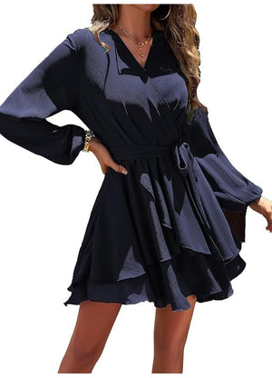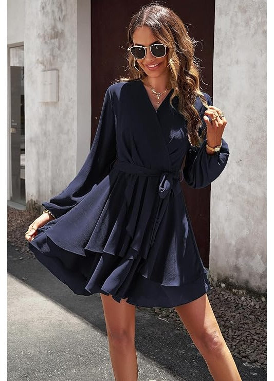 Rochie dama Jiraewh, poliester, albastru inchis, marimea M, cu cordon, decolteu in V, maneci lungi