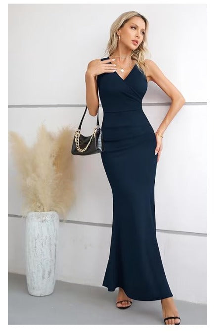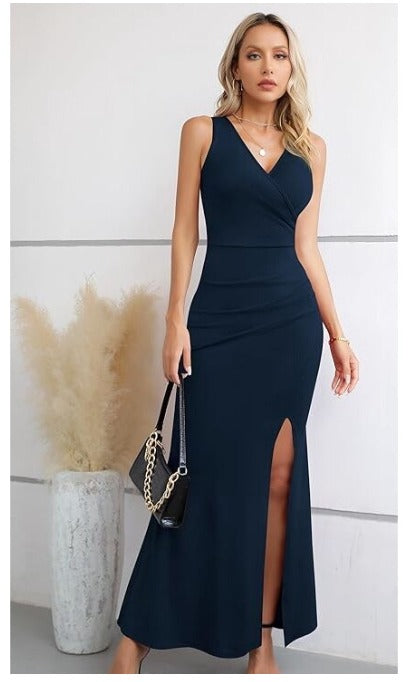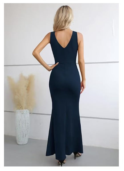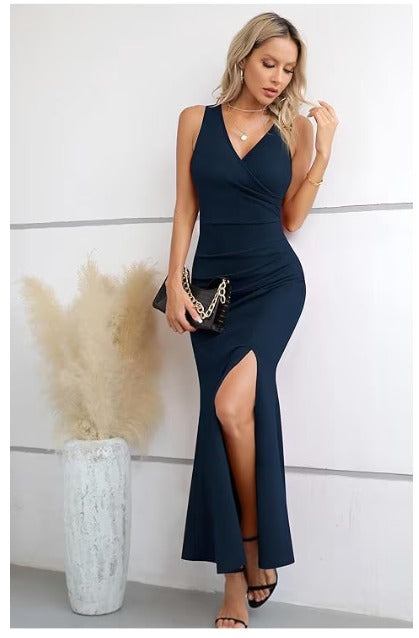 Rochie de cocktail, decolteu in V, poliester, marimea XS, culoare albastru inchis