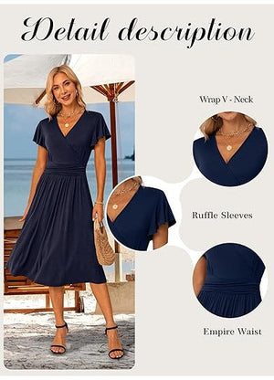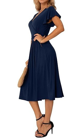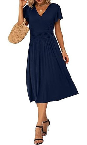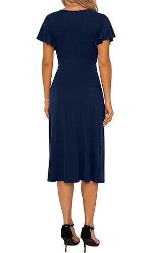 Rochie eleganta dama Jiraewh, midi, cu decolteu in V, maneca scurta, talie inalta, croi A-line, marimea S, culoare albastru inchis