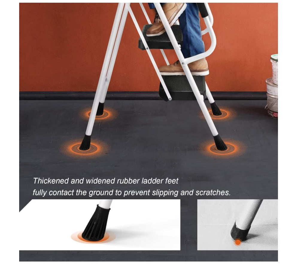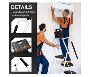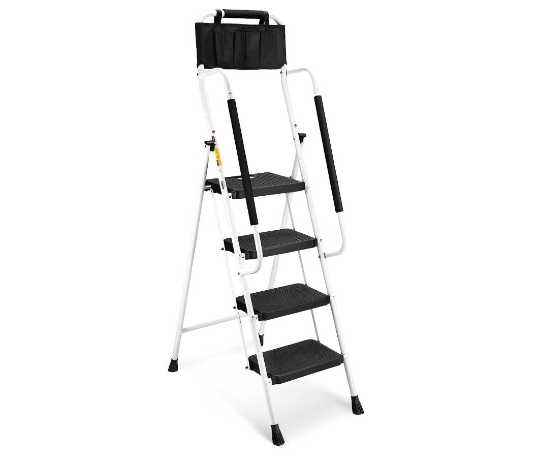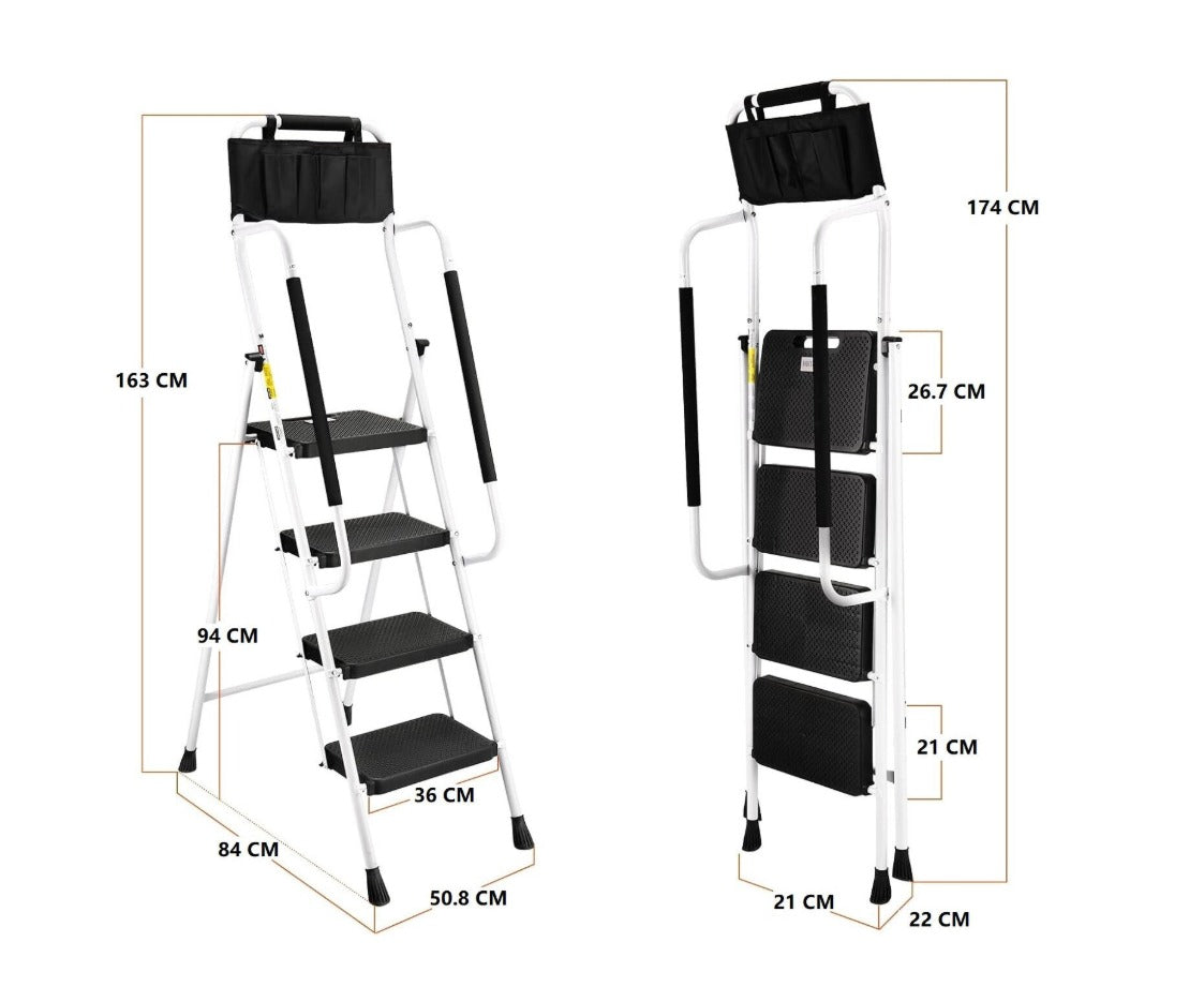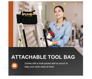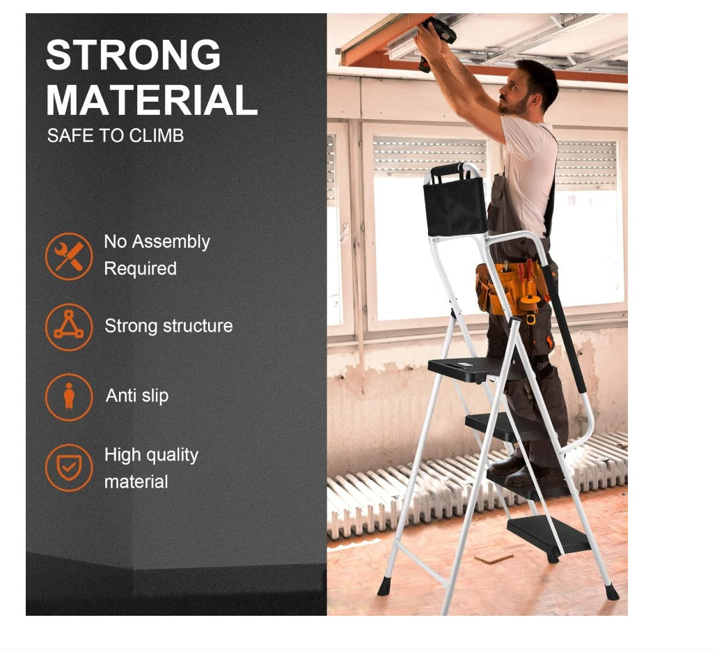 Scara pliabila HBTower, 4 trepte, balustrade laterale, otel, trepte antialunecare, geanta pentru unelte, culoare alb