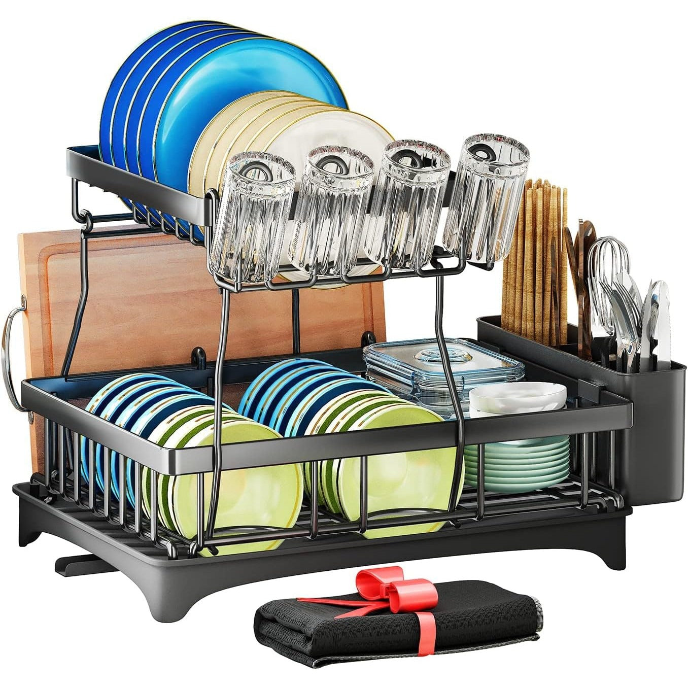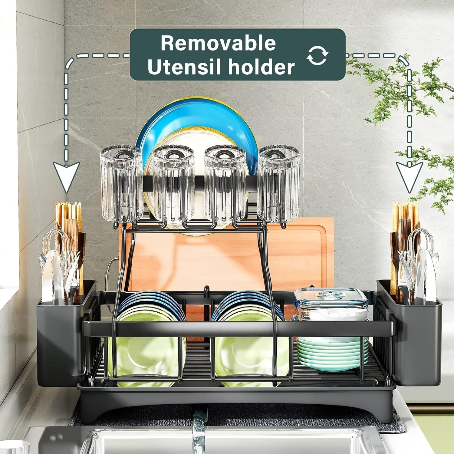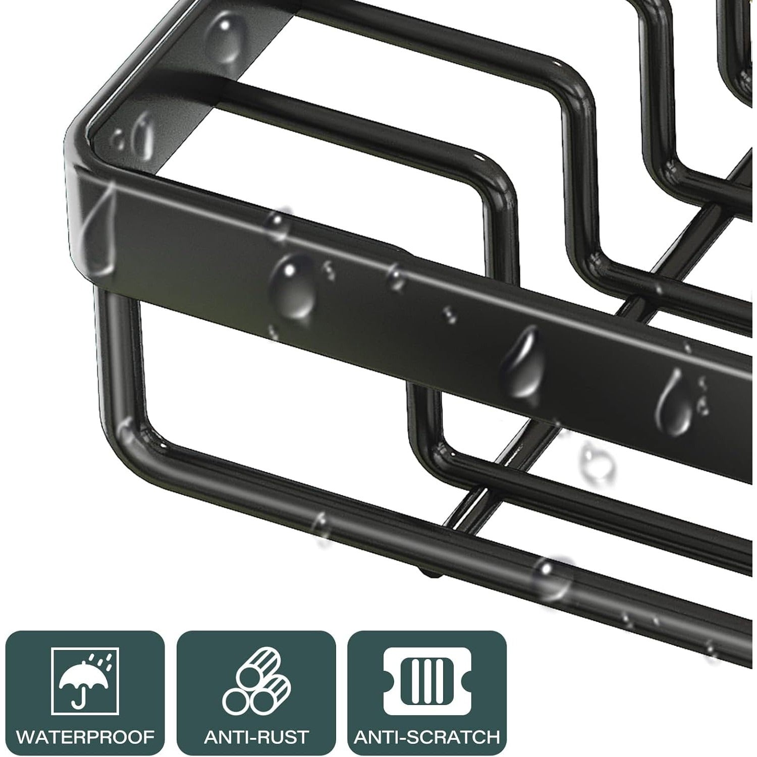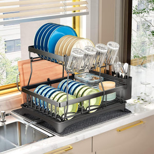 Scurgator de Vase SAYZH, 2 Nivele, 44.5 x 12.5 x 32.5 cm, Otel Carbon, Tava Scurgere Automata, Suport Tacamuri, Suport Pahare si Tocator, Negru