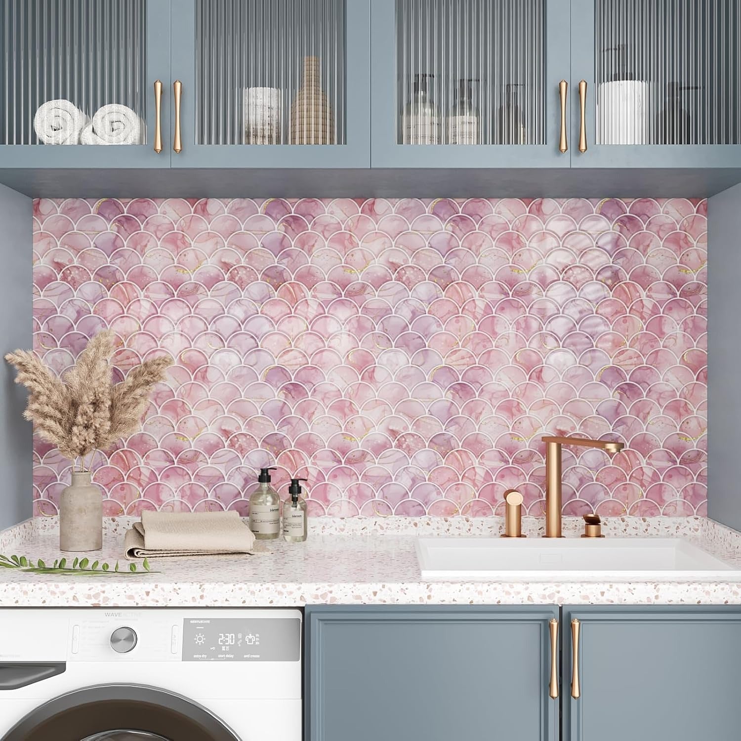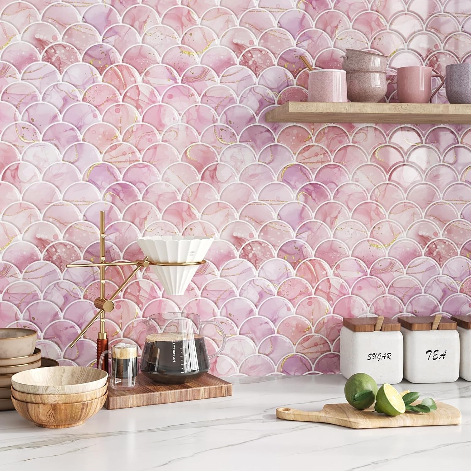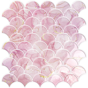 Set 12 stickere decorative VEELIKE, model solzi peste, roz marmura, 30x30 cm, impermeabile, autoadezive