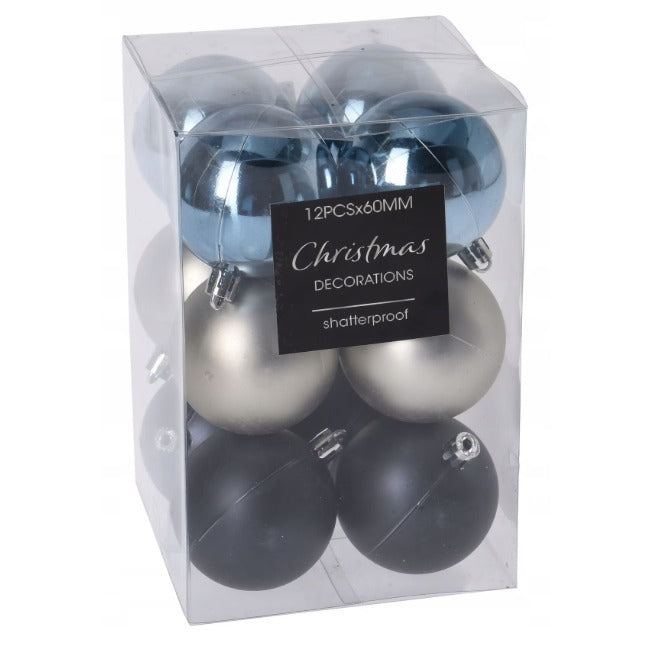 Set de 12 globuri Craciun, plastic, 6 cm, culoare albastru, argintiu si albastru inchis