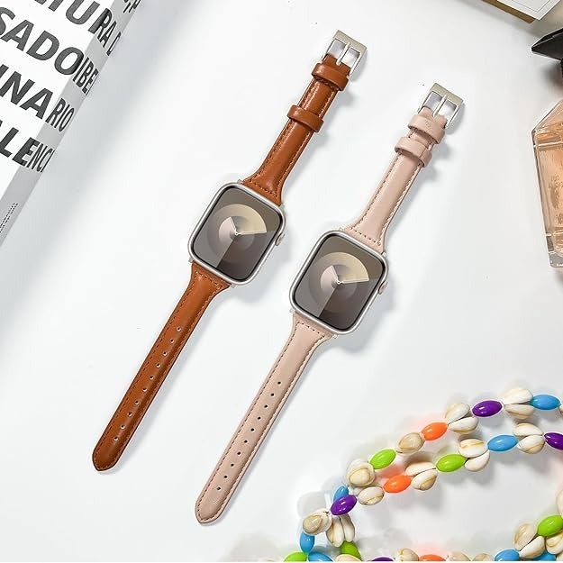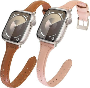 Set de 2 Curele de Smartwatch Lovmunia, Subtiri, Piele, compatibile cu Apple Watch Ultra/SE/9/8/7/6/5/4/3/2/1 - 38/40/41/42/44/45/49MM, culoare Maro/Roz cu Argintiu