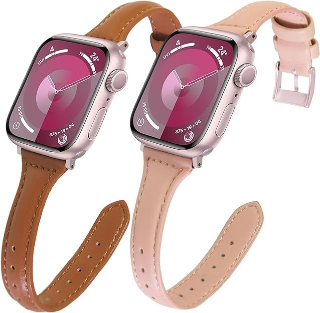 Set de 2 Curele de Smartwatch Lovmunia, Subtiri, Piele, compatibile cu Apple Watch Ultra/SE/9/8/7/6/5/4/3/2/1 - 38/40/41/42/44/45/49MM, culoare Maro/Roz cu Auriu