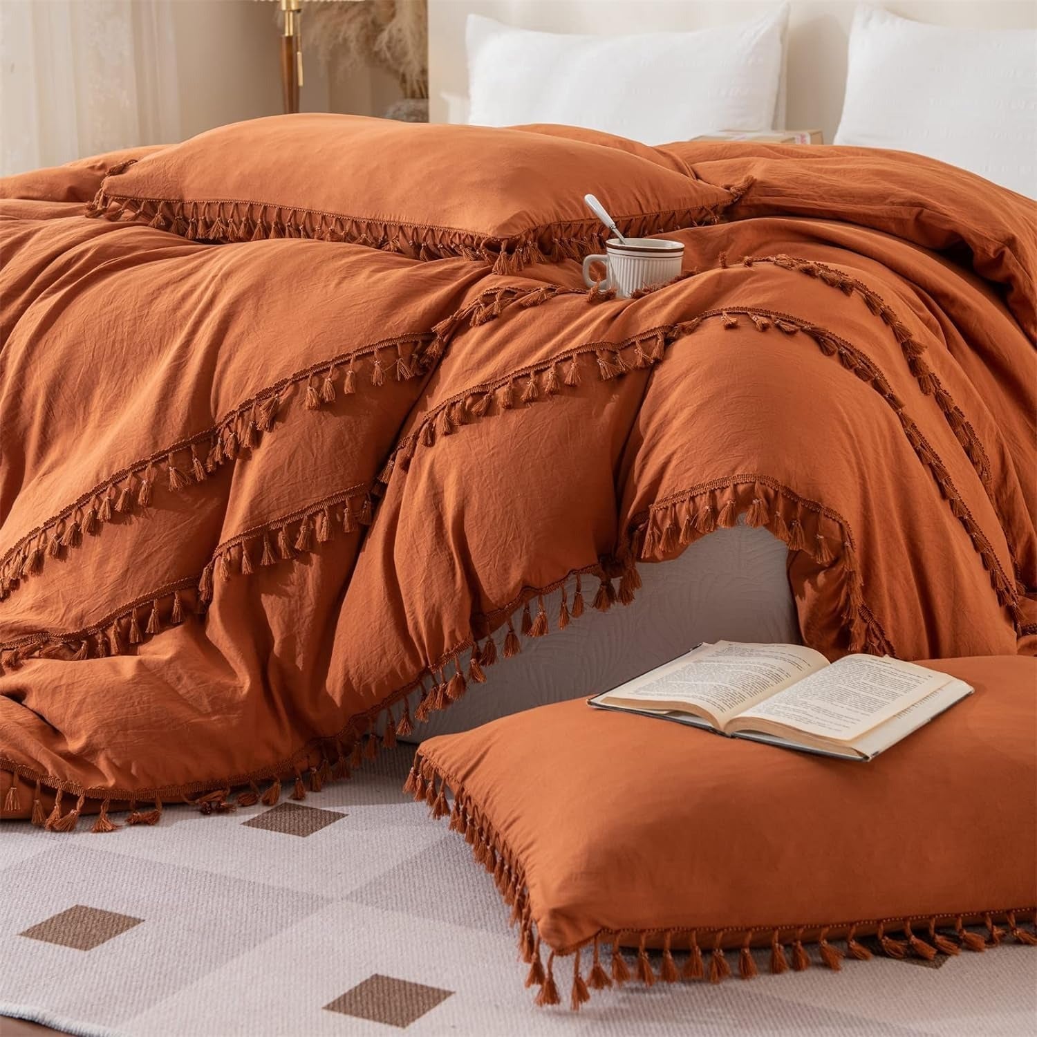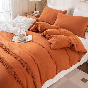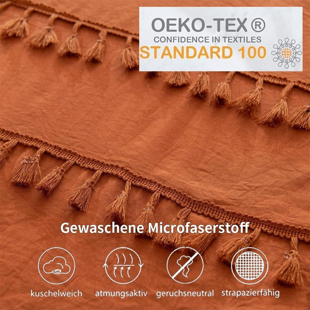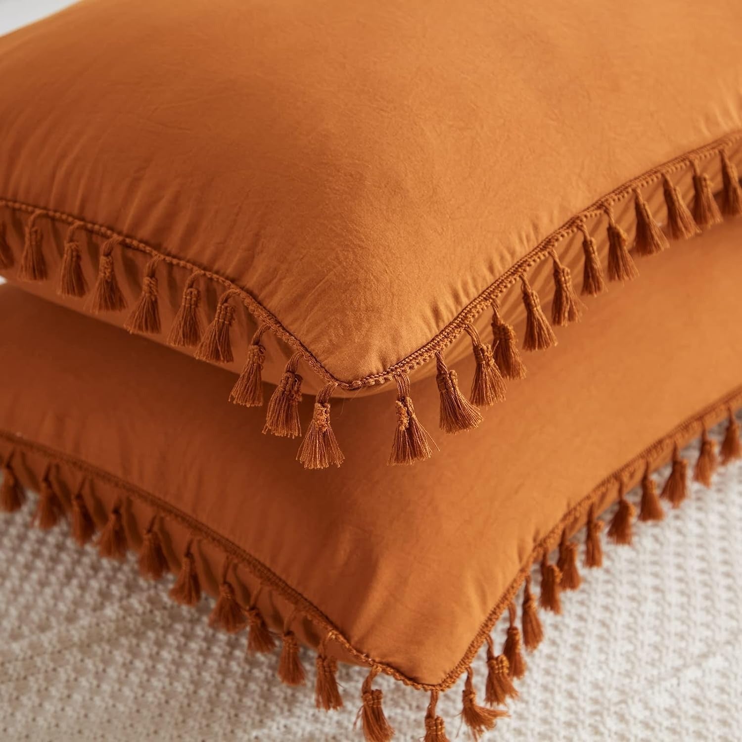 Set de 2 huse pentru perne Freyamy Bohemian, 40 x 80 cm, Ciucuri, stil boho chic, Microfibra, Fermoar, culoare Caramel