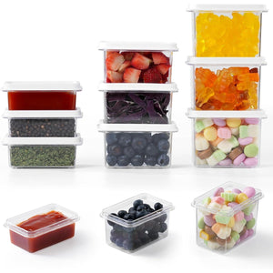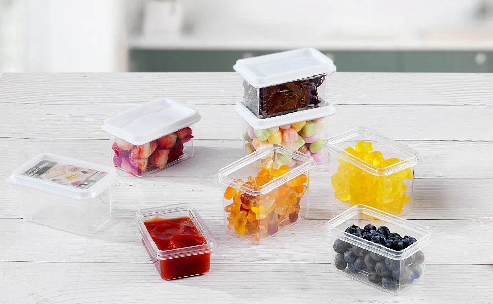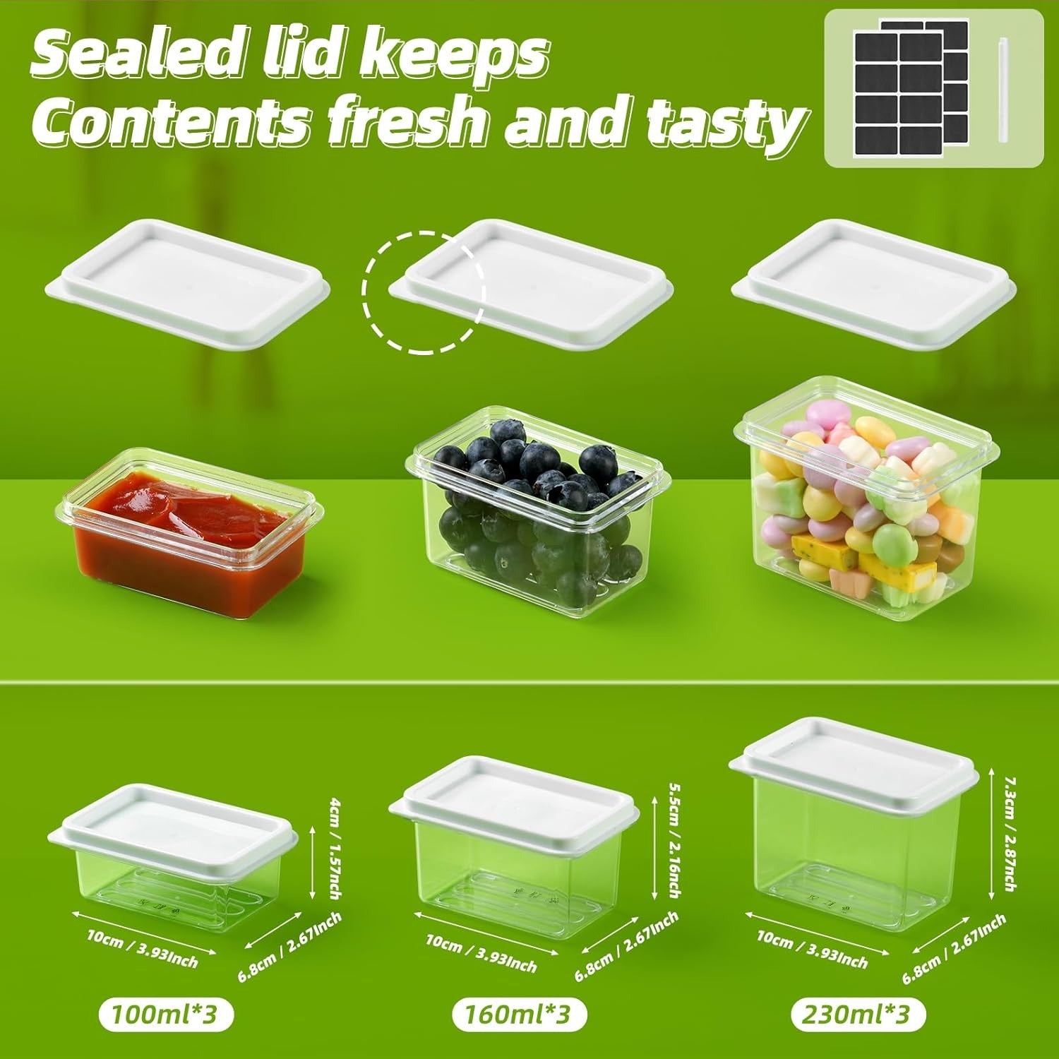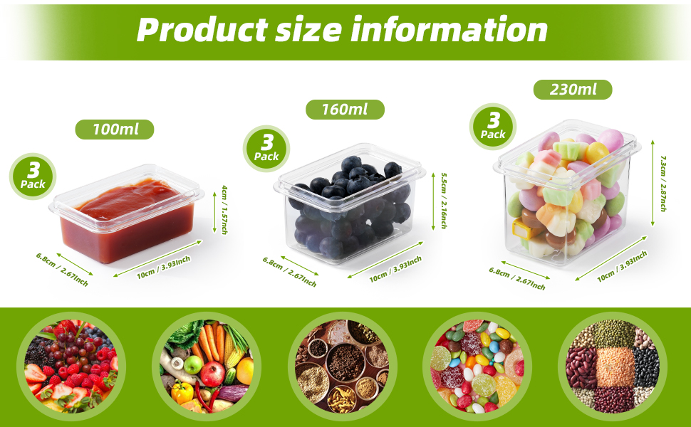 3 x 100 ml (10 x 6.8 x 4 cm), 3 x 160 ml (10 x 6.8 x 5.5 cm), 3 x 230 ml (10 x 6.8 x 7.3 cm)