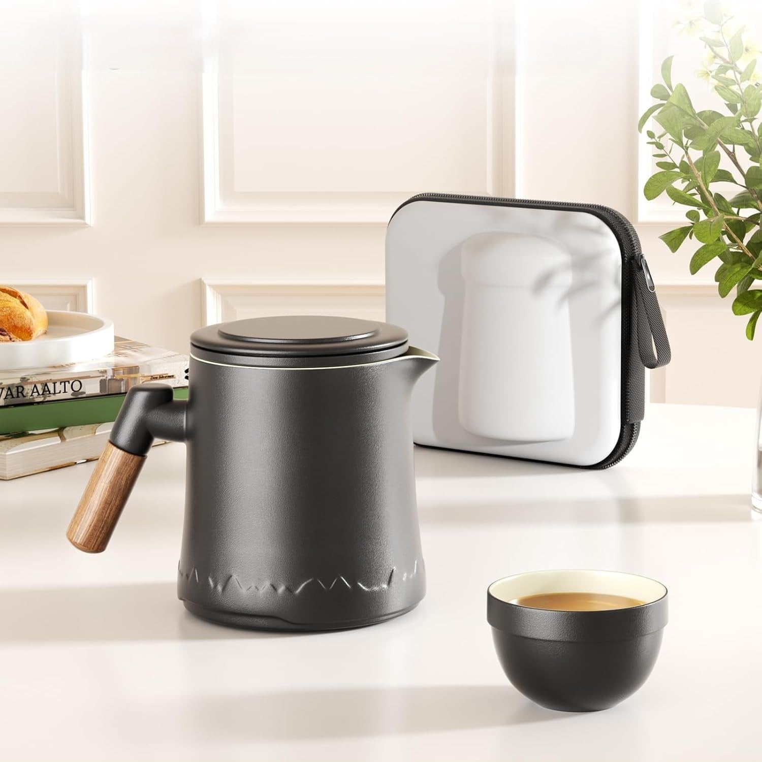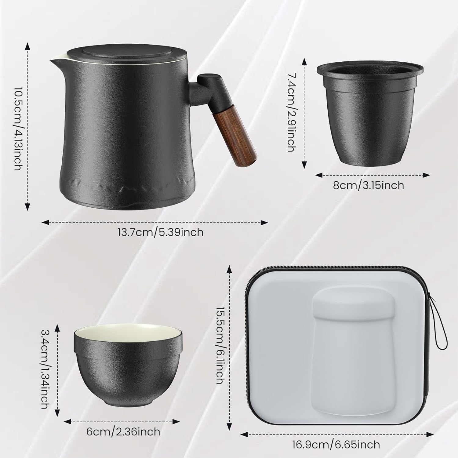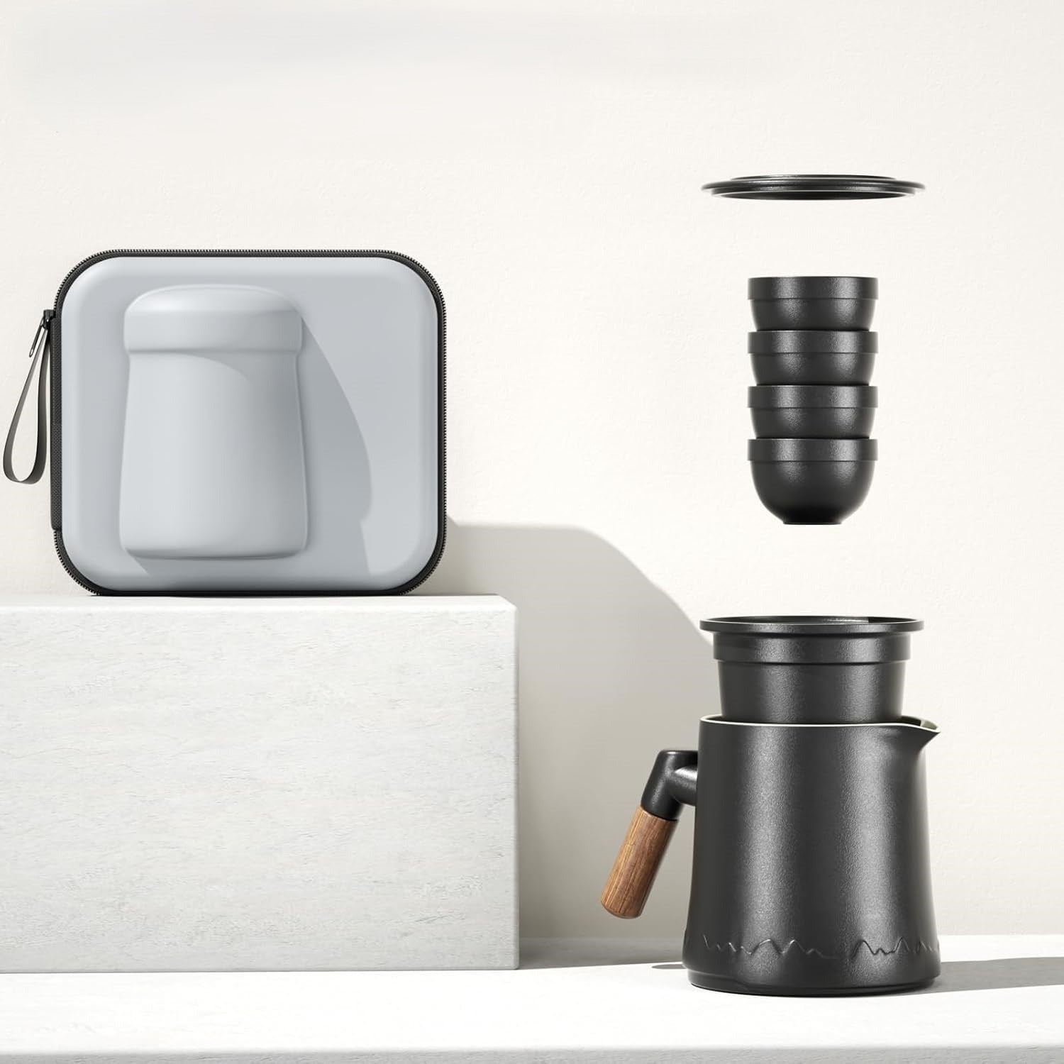 Set de ceai Mihoho, ceramica, 4 cesti, infuzor, capac, husa transport, portabil, ergonomic, negru