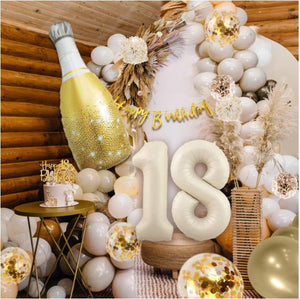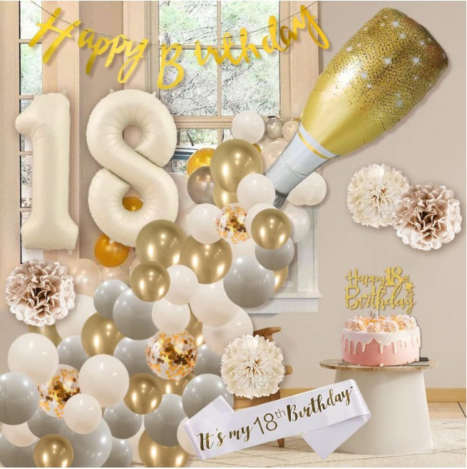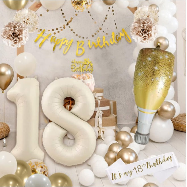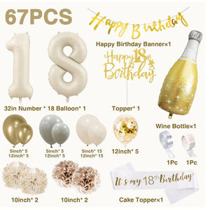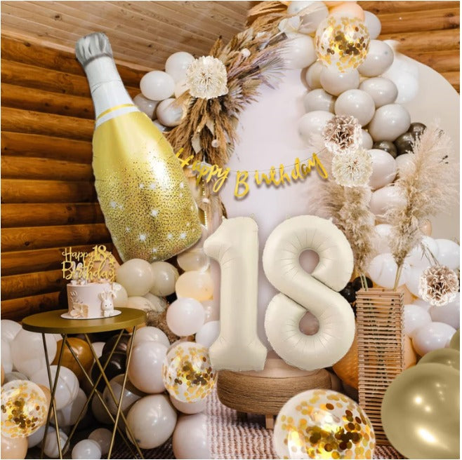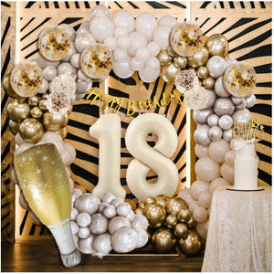 Set decoratiuni 18 ani SunnyLisa, arc cu baloane bej si auriu, balon cifre, pahare sampanie, Happy Birthday, usor de montat