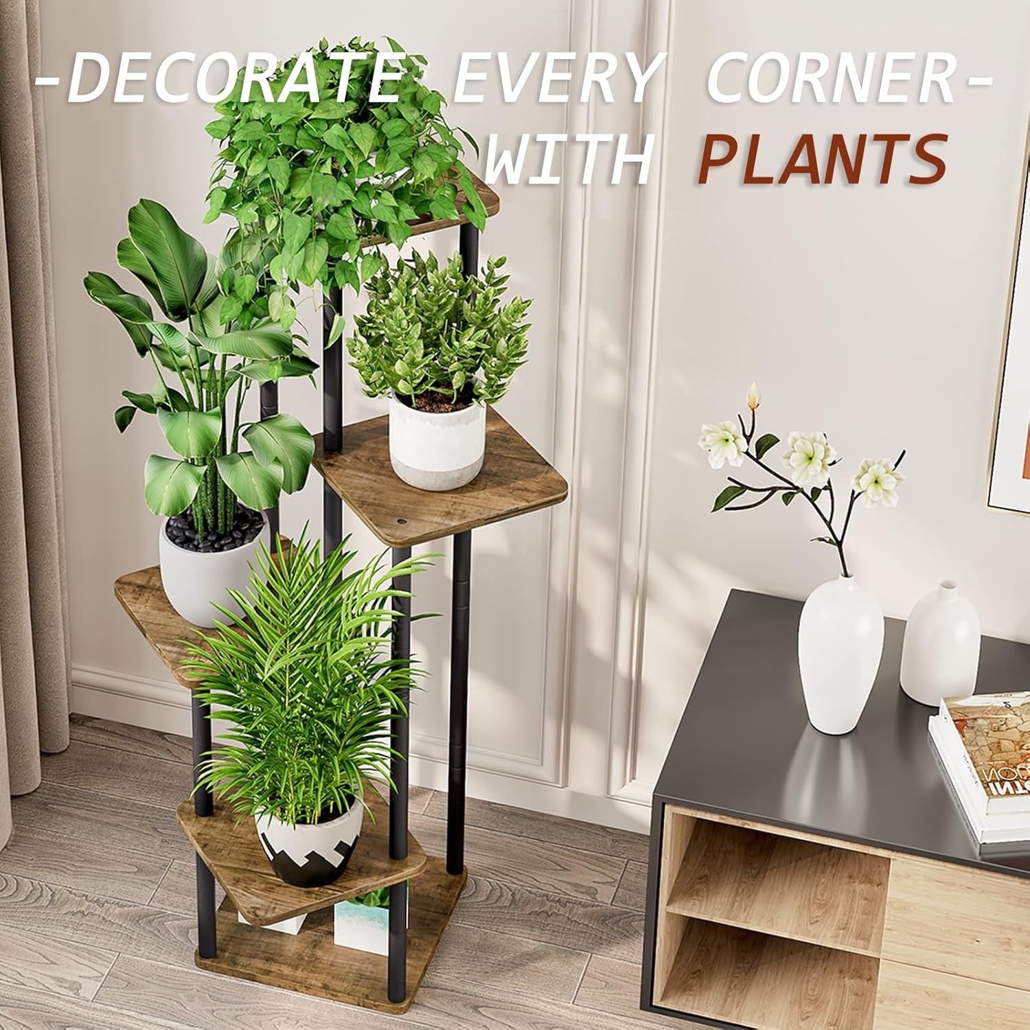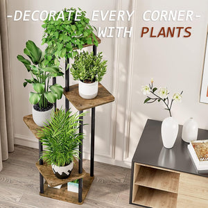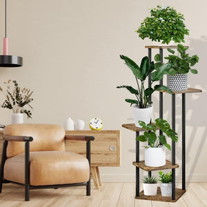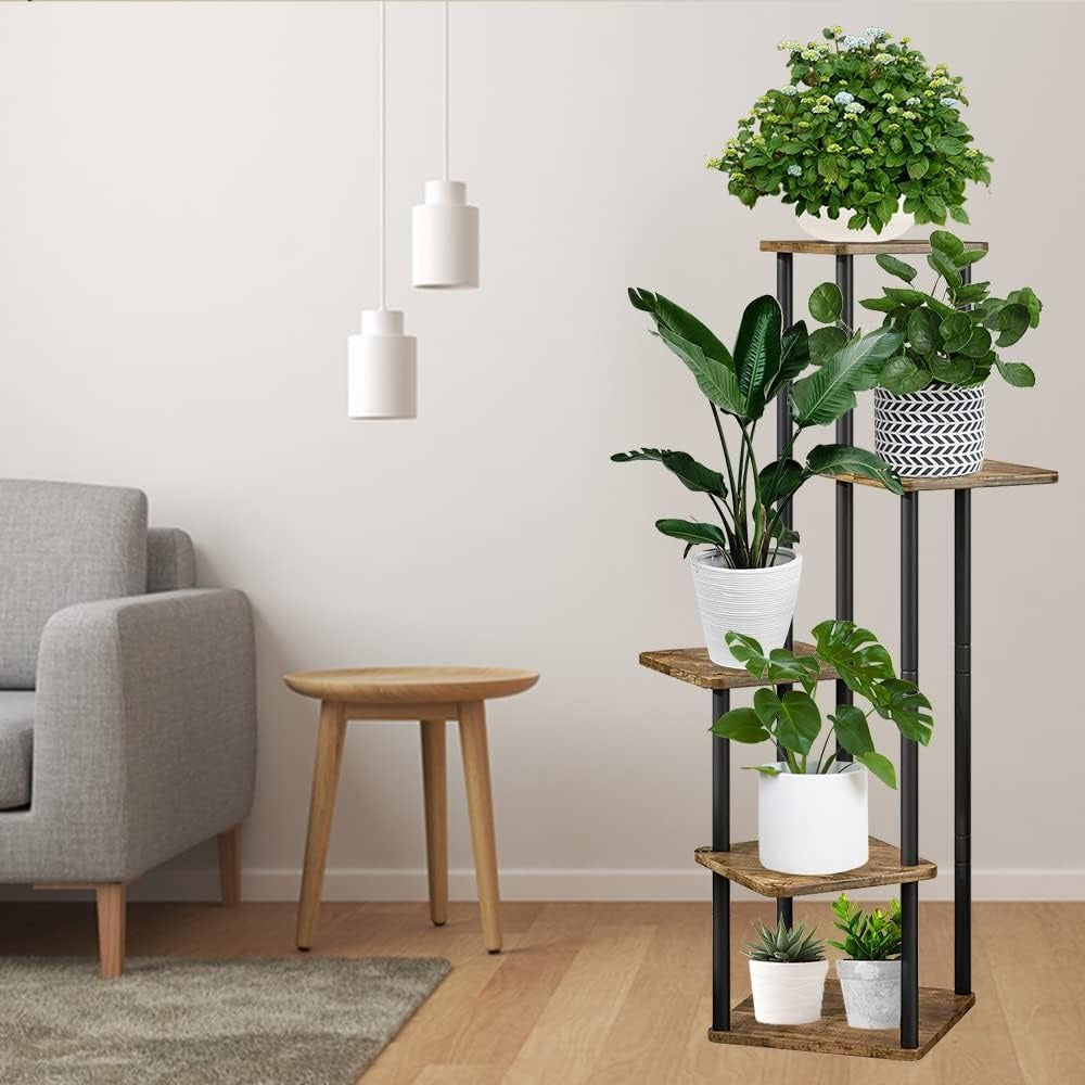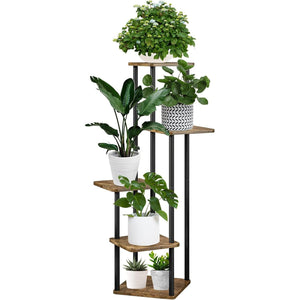 Suport pentru Plante MUAEEOK, 30x30x106 cm, 5 Etaje, Metal si MDF, culoare Negru si Maro