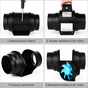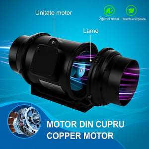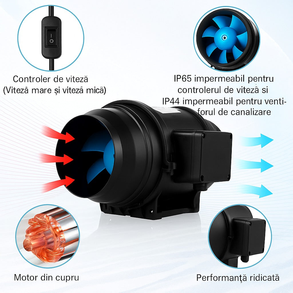 Ventilator de tubulatura Brogachy 150 mm, 2 trepte, debit 215 m³/h, motor din cupru, IP44, control viteza, pentru baie, bucatarie, sere, hidroponie